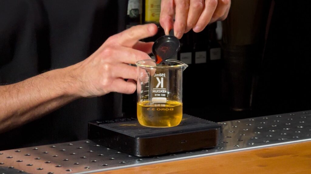 - Raffredda e diluisci il Cordiale al Sauternes e zafferano nel Mixing glass;